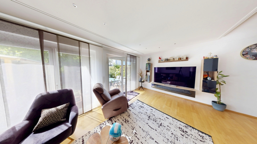 Bereits beim Betreten überzeugt der einladende Eingangsbereich mit einem praktischen Windfang und einem Gäste-WC. Von hier aus gelangen Sie in den offen gestalteten Wohnbereich, der durch seine Split-Level-Bauweise eine besondere Raumwirkung entfaltet. Der Essbereich mit angrenzender Küche und Fenster bildet das kommunikative Herzstück des Hauses. Eine halbe Ebene tiefer öffnet sich das großzügige Wohnzimmer mit großflächiger Fensterfront und Zugang zur gepflegten Terrasse und dem sonnigen Garten – ein idealer Ort für Erholung und gemütliche Stunden.